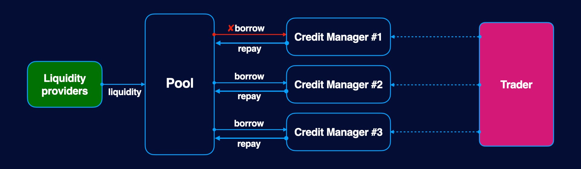 CreditManager is core contract to manager credit accounts. In V2, CreditManager itself is designed as low-level backed contract. One pool could be connected with a few of creditManagers, however, CreditManager could be connected with one pool only. It's possible to forbid borrowing money from pool, however, each CreditManager could repay money back.